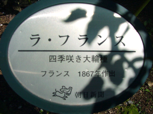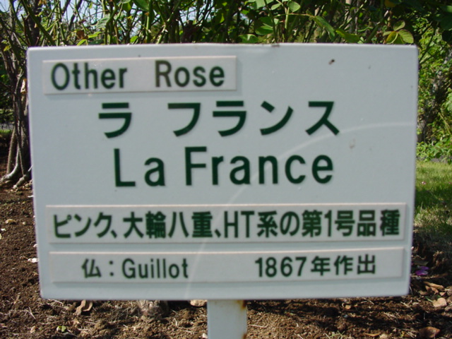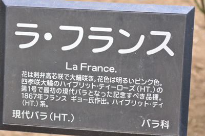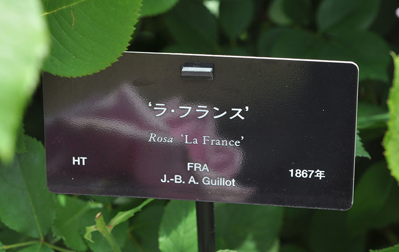 花は剣弁高芯咲で大輪咲き。花色は明るいピンク色。四季咲大輪のハイブリット・ティーローズ(HT.)の第1号で最初の現代バラとなった記念すべき品種。1867年フランス ギヨー氏作出。ハイブリット・ティ(HT.)系。(神代植物公園名札より)