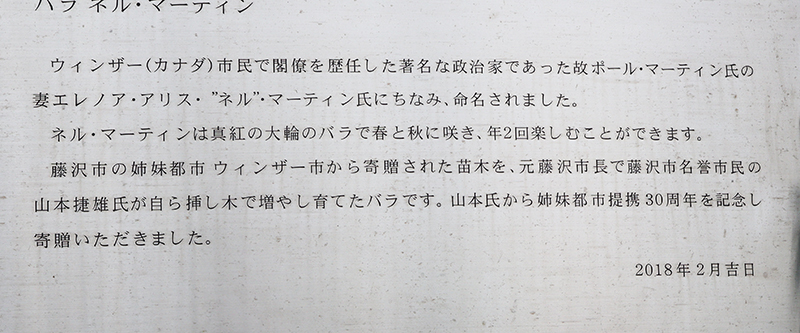 藤沢市の姉妹都市ウィンザー市から寄贈された苗木を、元藤沢市長で藤沢市名誉市民の山本捷雄氏が自ら挿し木で増やし育てたバラです。