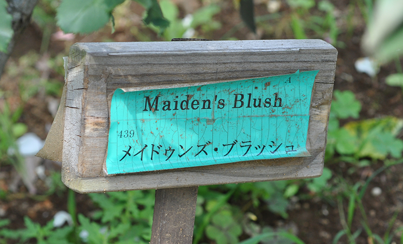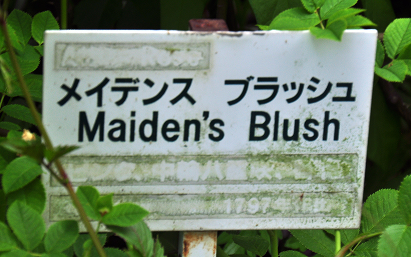 フランス名は、Cuisse de Nymphe Émue「うろたえる妖精(乙女、花嫁)の太腿」といいます。ずいぶん文学的な名前ですが、これはファッション業界で使われた想像力を膨らませるような色名のひとつとして、18世紀頃使われていたようです。 英語名ではこれを翻訳したようなMaiden’s Blush「頬を染める乙女」として広まりました。 他にもRosa Incarnataという名前がありますが、これも人肌の淡いピンクを示しています。(篠宮バラ園より)