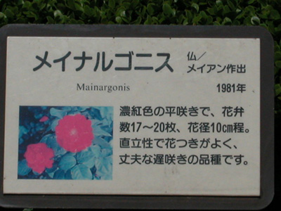 メイナルゴニス 四季咲き 2013.04.212025.11.02 Mainargonis 5月26日 日比谷公園 別名 Meinargonis 種類 F フロリバンダ 作出・発表年 1981 作出者 Meilland 作出国 フランス 受賞 親子関係 メモ 名札 日比谷公園