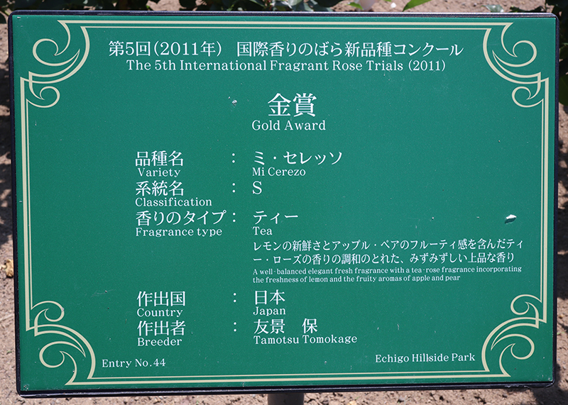 レモンの新鮮さとアップル・ペアのフルーティ感を含んだティー・ローズの香りの調和のとれた、みずみずしい上品な香り(国営越後丘陵公園名札より)