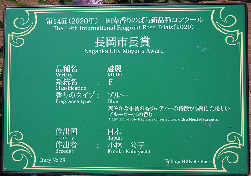 爽やかな柑橘の香りにティーの特徴が調和した優しいブルーローズの香り(国営越後丘陵公園名札より)