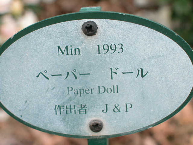 ペーパー ドール 四季咲き 2014.11.292025.09.15 Paper Doll 5月22日 河津バガテル公園 別名 種類 Min ミニチュア 作出・発表年 1992 作出者 Zary, Dr. Keith W. 作出国 アメリカ 受賞 親子関係 Fiddler’s Gold × Sequoia Gold メモ 名札 河津バガテル公園