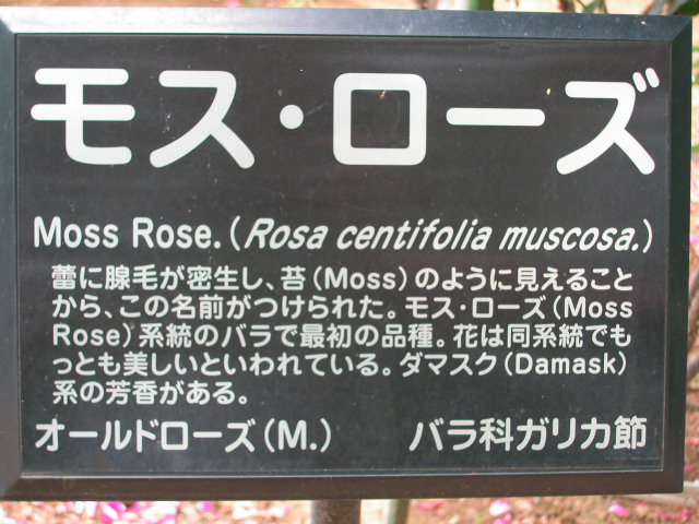 蕾に腺毛が密生し、苔(Moss)のように見えることからこの名前がつけられた。モス・ローズ(Moss Rose)系統のバラで最初の品種。花は同系統でもっとも美しいといわれている。ダマスク(Damask)系の芳香がある。オールドローズ(M.)ガリカ節(神代植物公園名札より)