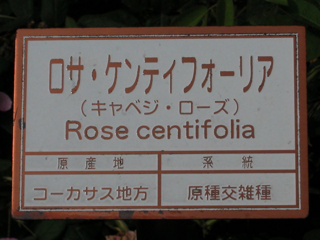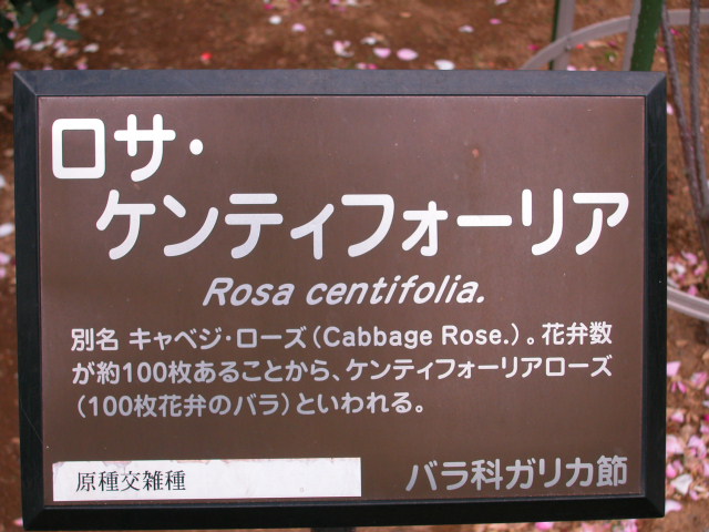 別名キャベッジ・ローズ(Cabbage Rose)。花弁数が約100枚あることからケンティフォーリアローズ(100枚花弁のバラ)といわれる。原種交雑種 ガリカ節(神代植物公園名札より)
