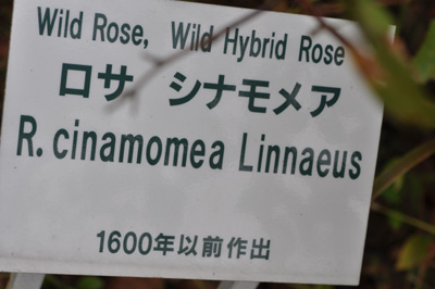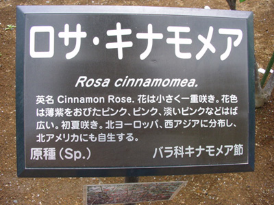 英名 Cinnamon Rose。花は小さく一重咲き。花色は薄紫をおびたピンク、ピンク、淡いピンクなどはば広い。初夏咲き。北ヨーロッパ、西アジアに分布し、北アメリカにも自生する。原種(Sp.)キナモメア節(神代植物公園名札より)
