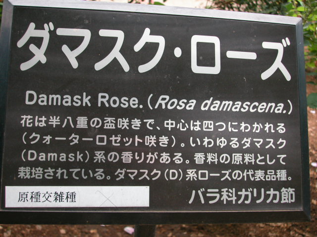 花は半八重の盃咲きで、中心は四つにわかれる(クォーターロゼット咲き)。いわゆるダマスク(Damask)系の香りがある。香料の原料として栽培されている。ダマスク(D)系ローズの代表品種。原種交雑種 ガリカ節(神代植物公園名札より)