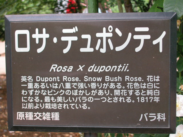 英名Dupont Rose。 Snow Bush Rose。花は一重あるいは八重で強い香りがある。花色は白にわずかなピンクのぼかしがあり、開花すると純白になる。最も美しいバラの一つとされる。1817年以前より栽培されている。原種交雑種(神代植物公園名札より)