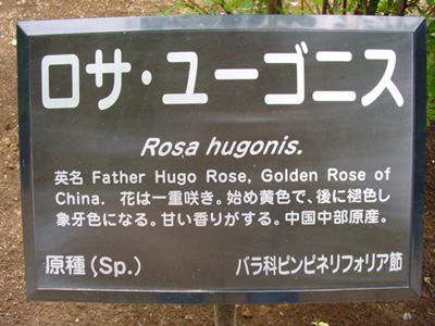 英名Father Hugo Rose、Golden Rose of China。花は一重咲き。始め黄色で、後に褪色し象牙色になる。甘い香りがする。中国中部原産。原種(Sp.)ピンピネリフォリア節(神代植物公園名札より)