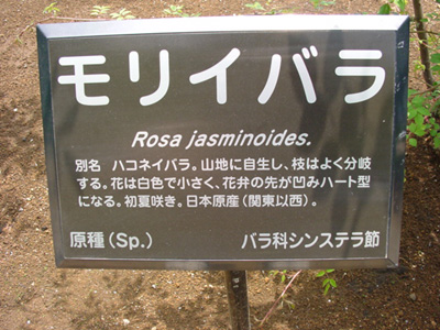 別名ハコネイバラ。山地に自生し、枝はよく分岐する。花は白色で小さく、花弁の先が凹みハート型になる。初夏咲き。日本原産(関東以西)。シンステラ節(神代植物公園名札より)