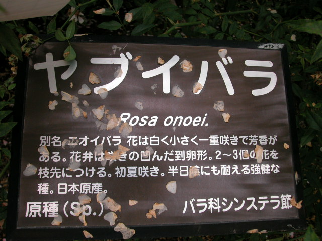 別名ニオイイバラ。花は白く小さく一重咲きで芳香がある。花弁はさきの凹んだ到卵型。2〜3個の花を枝元につける。初夏咲き。半日陰にも耐える強健な種。日本原産。シンステラ節(神代植物公園名札より)