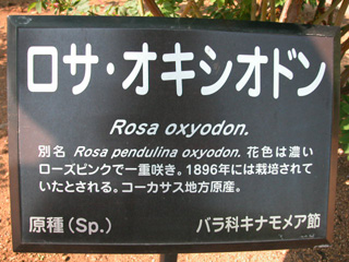 別名Rosa pendulina oxyodon。花色は濃いローズピンクで一重咲き。1896年には栽培されていたとされる。コーカサス地方原産。原種(Sp.)キナモメア節(神代植物公園名札より)