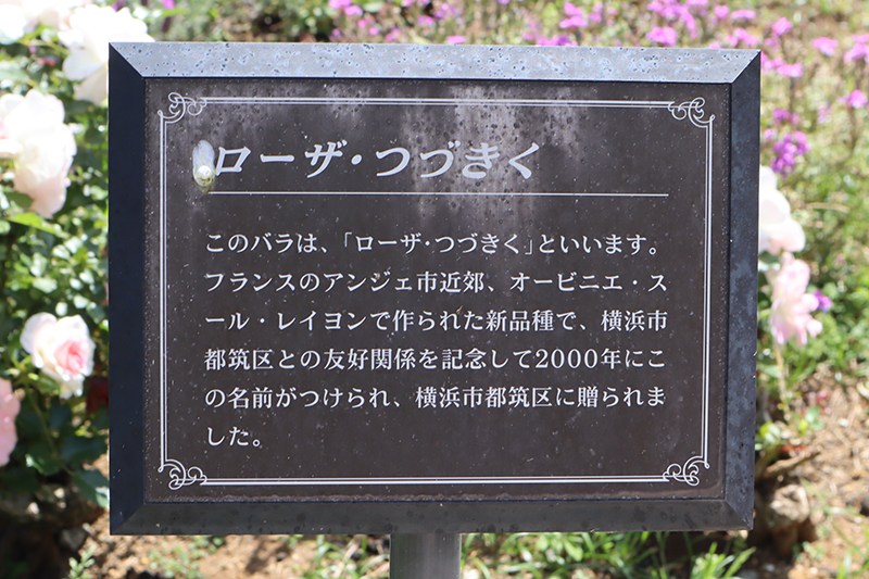 このバラは、「ローザ・つづきく」といいます。フランスのアンジェ市近郊、オービニエ・スール・レイヨンで作られた新品種で、横浜市都筑区との友好関係を記念して2000年にこの名前がつけられ、横浜市都筑区に贈られました。(港の見える丘公園名札より)