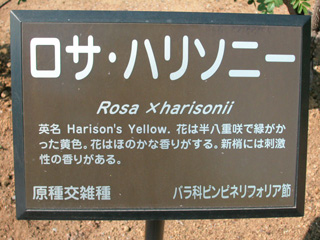 英名Harison’s Yellow。花は半八重咲で緑がかった黄色。花はほのかな香りがする。新梢には刺激性の香りがある。原種交雑種 ピンピネリフォリア節(神代植物公園名札より)