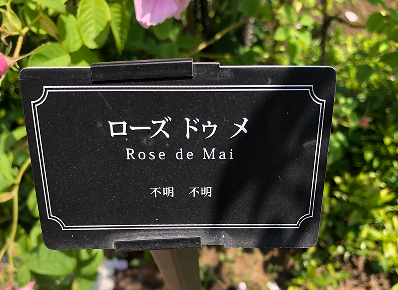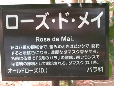 花は八重の房咲きで、蕾のときはピンクで、開花すると淡桃色になる。濃厚なダマスク香がする。名前は仏語で「5月のバラ」の意味。南フランスでは香料の原料として栽培される。ダマスク(D.)系。オールドローズ(D.)(神代植物公園名札より)