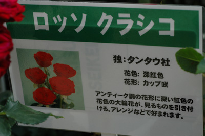 アンティーク調の花形に深い紅色の花色の大輪花が、見るものを引き付ける。アレンジなどで好まれます。(京成バラ園名札より)