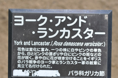 白地にピンクのストライプが入り、白ばらのヨーク家と赤ばらを紋章としたランカスター家にちなむ花名ですが、実際にははっきりと咲き分けないこともあります。(姫野ばら園 八ヶ岳農場より)